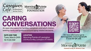 LEXINGTON, Ky. (March 3, 2026) — Families navigating aging, long-term care, and financial planning often find themselves asking the same questions: How do we protect what we’ve worked for? What documents do we really need? What happens if a loved one can no longer make decisions? The Morning Pointe Foundation Caregiver Café will be held
