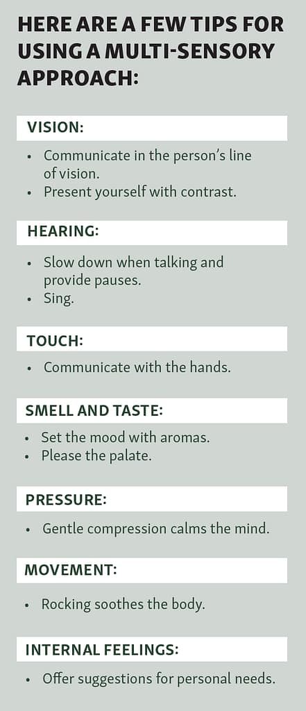 Fortunately, a multi-sensory approach can increase success when communicating with someone with Alzheimer’s disease.