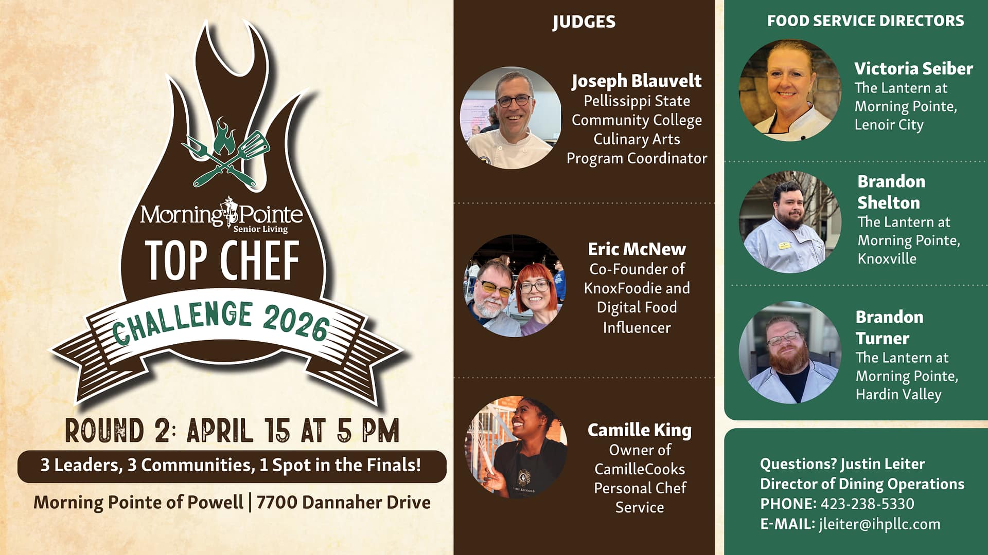 Three finalists to compete live on April 15 in the Morning Pointe culinary showdown KNOXVILLE, Tenn. — April 14, 2026 — Tomorrow! The heat is on as Morning Pointe Senior Living hosts the Smoky Regional Round of its 2026 Top Chef Challenge on April 15 at 5:00 p.m. at Morning Pointe of Powell Assisted Living.