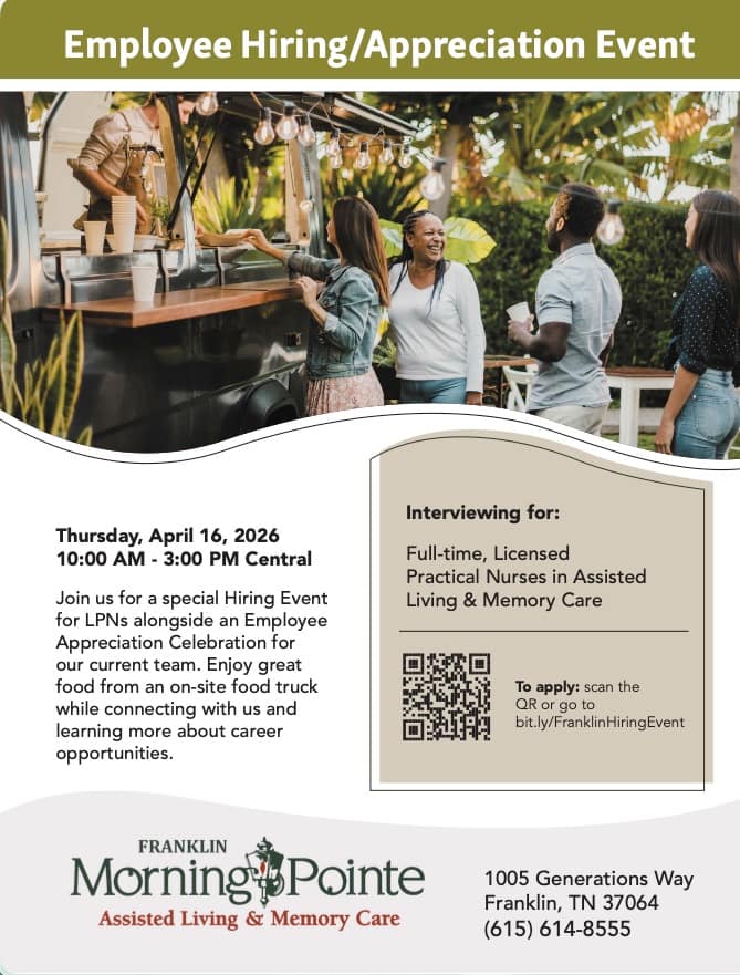 FRANKLIN, Tenn. —April 9, 2024—Morning Pointe of Franklin Assisted Living is bringing together career opportunities and community appreciation with a Hiring Event and Employee Appreciation Day on Thursday, April 16. From 10 a.m. to 3 p.m. Central Time, the community will welcome licensed practical nurses and others interested in joining the senior living field to