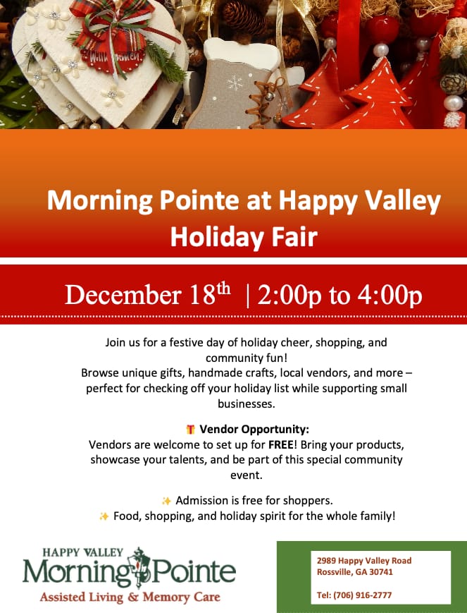 ROSSVILLE, GA — November 25, 2025 — Morning Pointe at Happy Valley Assisted Living and Memory Care is welcoming families, neighbors, and local shoppers to a festive Holiday Fair on Thursday, December 18, from 2:00 p.m. to 4:00 p.m. at 2989 Happy Valley Rd, Rossville, GA 30741. Guests will enjoy an afternoon filled with holiday