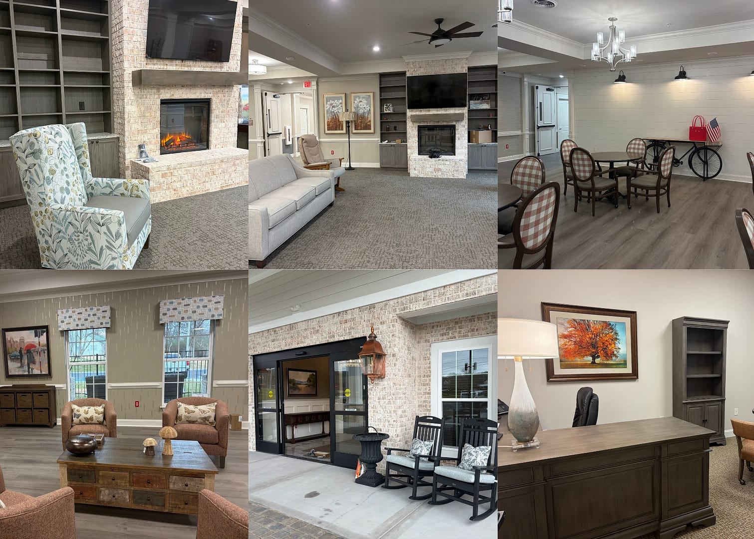 Multiple comfortable sitting areas are being framed to provide smaller, more intimate gathering spots for residents and families. A welcoming front porch gathering space is underway to provide a familiar, homelike setting where residents can relax, visit with loved ones, and enjoy meaningful moments together.