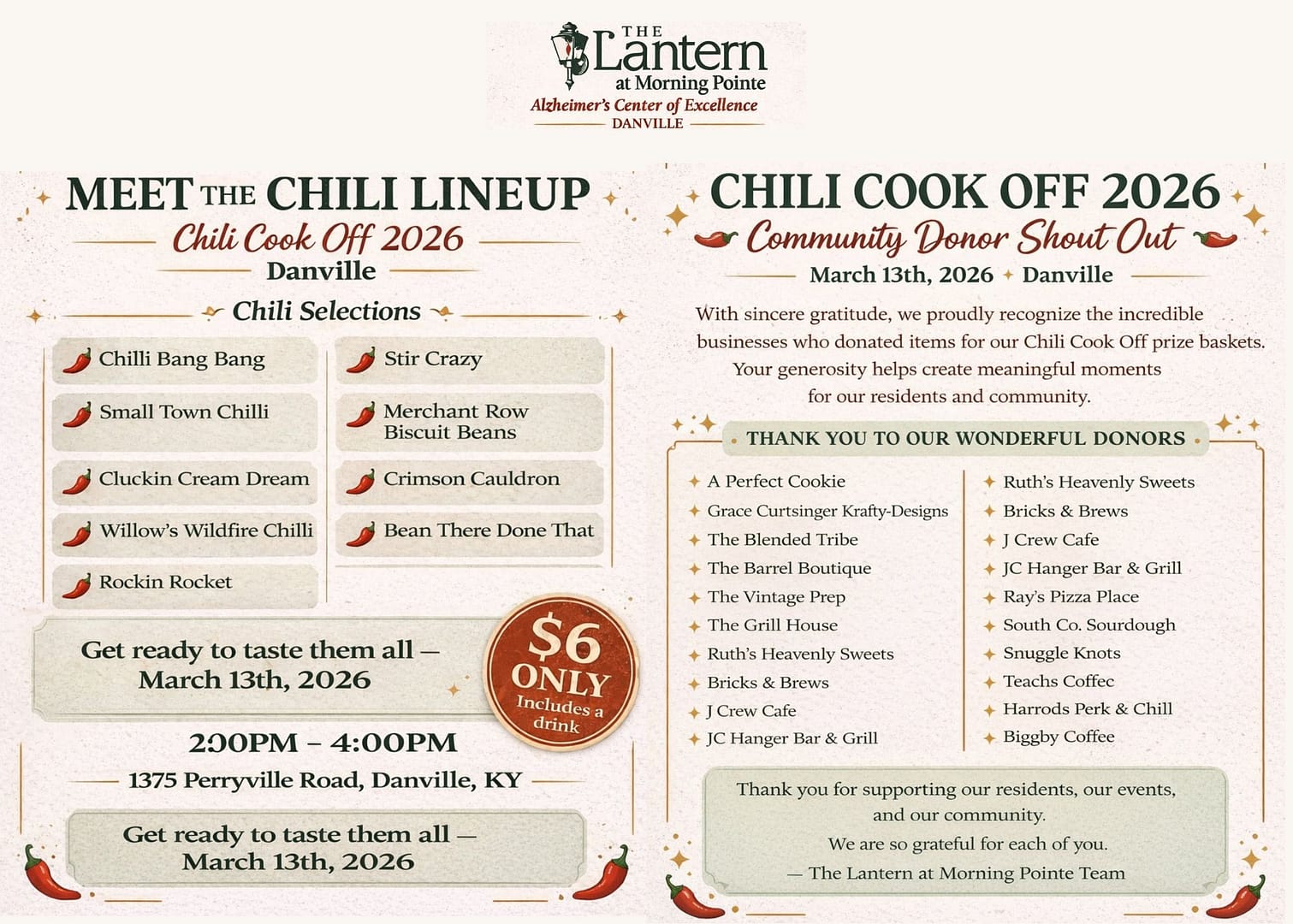 DANVILLE, Ky. — February 25, 2026—The Lantern at Morning Pointe Alzheimer’s Center of Excellence, Danville, located at 1375 Perryville Rd, Danville, KY 40422, part of the full-service Morning Pointe Senior Living campus, is inviting the community to “meet the chili lineup” at its Chili Cook-Off 2026 on Friday, March 13 from 2:00 PM to 4:00 PM.