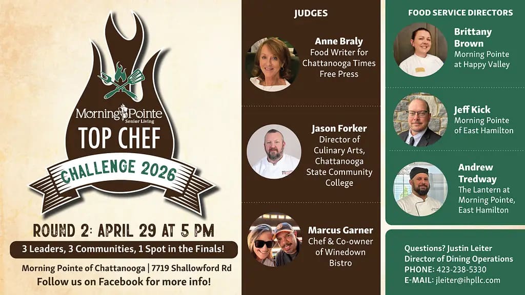 Excitement is building in Chattanooga as Morning Pointe Senior Living’s 2026 Top Chef Challenge Regional Round 2 kicks off today at 5:00 p.m. at Morning Pointe of Chattanooga. The live cook-off is open to the public, and guests are invited to attend and cheer on the competitors.