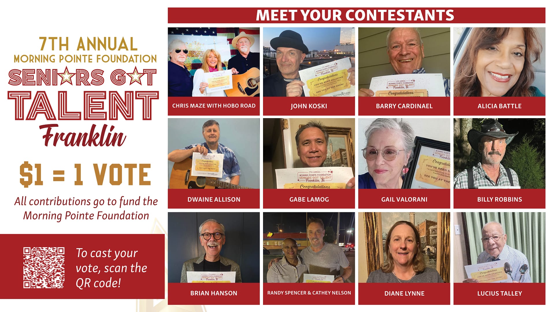 FRANKLIN, Tenn. (September 29, 2025) — Meet the stars of this year’s most inspiring stage event! Twelve senior performers are ready to shine at the Morning Pointe Foundation’s 7th Annual Seniors Got Talent Franklin showcase, happening Tuesday, October 14, at 7 p.m. at the historic Franklin Theatre. From soulful singers and gifted musicians to unforgettable specialty acts, each performer brings a unique story and a spark that promises a night filled with talent, joy, and community spirit — all leading up to the $1,000 grand prize.