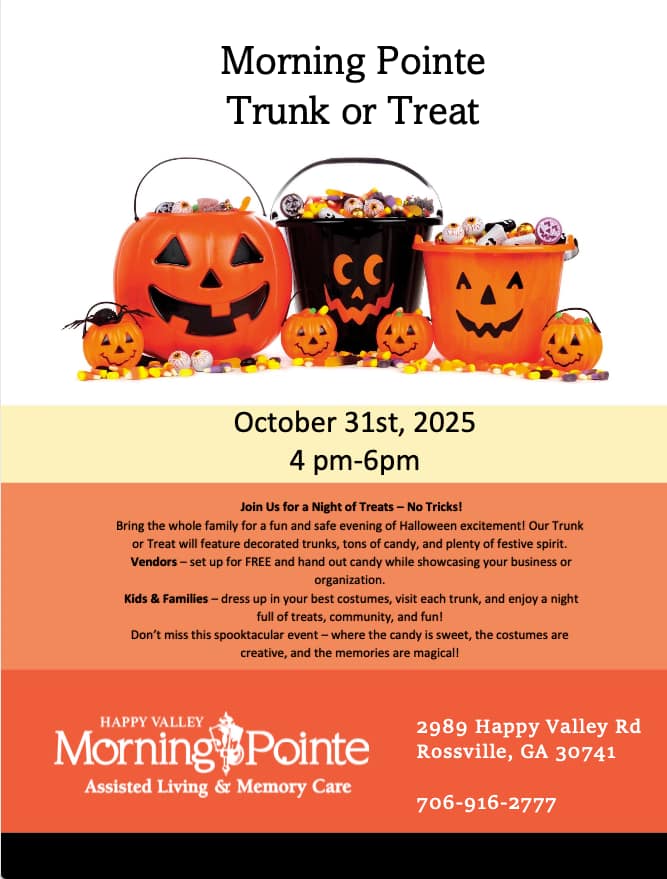 ROSSVILLE, Ga. (October 27, 2025) — Morning Pointe at Happy Valley Assisted Living invites families, friends, and neighbors to its annual Trunk or Treat on Friday, October 31, from 4 to 6 p.m. at 2989 Happy Valley Road in Rossville.