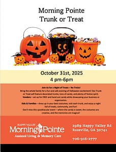 ROSSVILLE, Ga. (October 27, 2025) — Morning Pointe at Happy Valley Assisted Living invites families, friends, and neighbors to its annual Trunk or Treat on Friday, October 31, from 4 to 6 p.m. at 2989 Happy Valley Road in Rossville. This free community event promises a fun and festive evening filled with candy, costumes, and