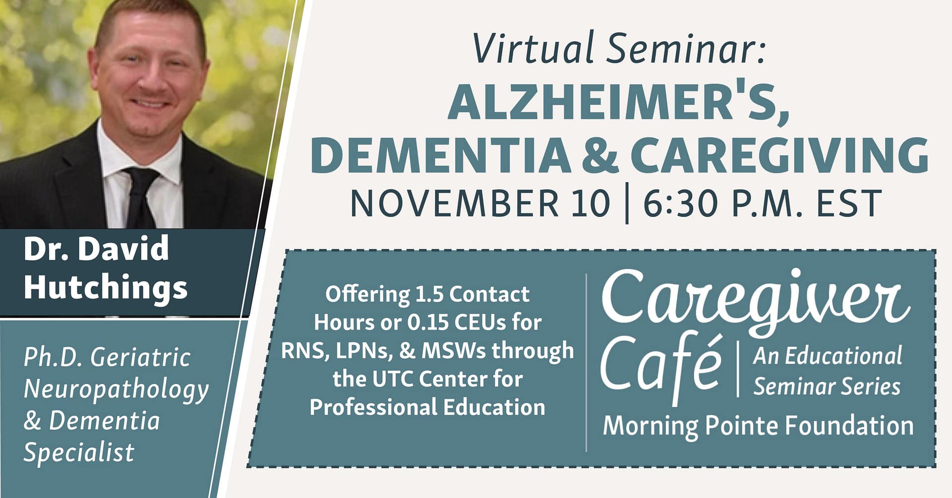 The Morning Pointe Foundation will offer its first Caregiver Café webinar with continuing education credit (CEUs) on Nov. 10 at 6:30 p.m. Eastern Time.