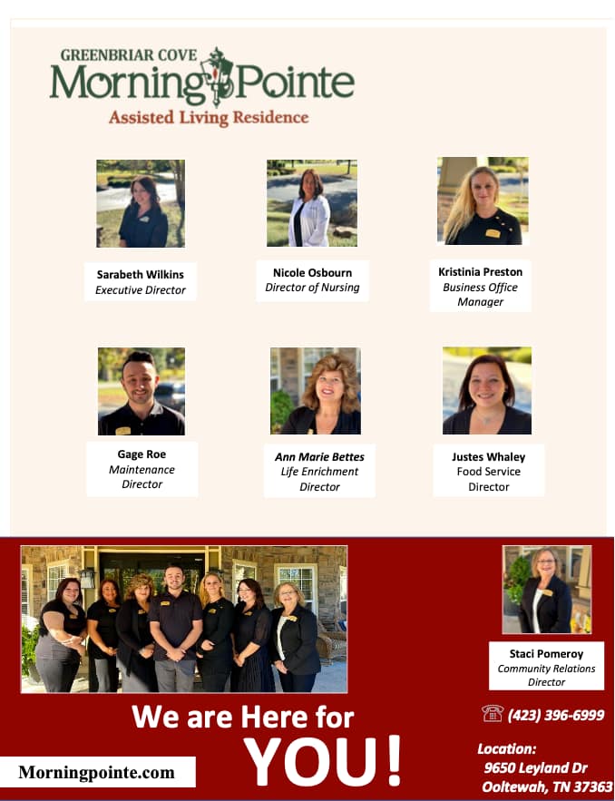 Founded in 1997 by Greg A. Vital and Franklin Farrow, Morning Pointe Senior Living operates 42 assisted living and Alzheimer’s memory care communities across five southeastern states. In the Tennessee Valley, communities are located in Chattanooga, East Hamilton, Collegedale, Hixson, and Walker County, Georgia.