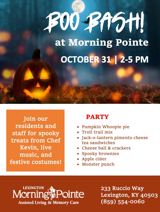 LEXINGTON, Ky. (October 27, 2025) – Morning Pointe of Lexington invites the community to join residents and staff for an afternoon of spooky fun and seasonal celebration at the annual Boo Bash, happening Friday, October 31, from 2–5 p.m. at 233 Ruccio Way, Lexington, KY 40503.