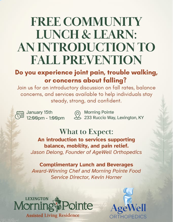 The program will be led by Jason DeLong, founder of AgeWell Orthopedics, who will share insight into fall prevention strategies and resources designed to support independence as people age.