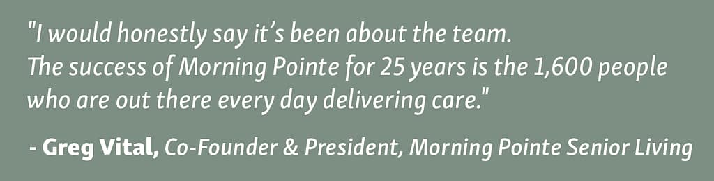“I would honestly say it’s been about the team,” says Vital. “The success of Morning Pointe for 25 years is the 1,600 people who are out there every day delivering care.”