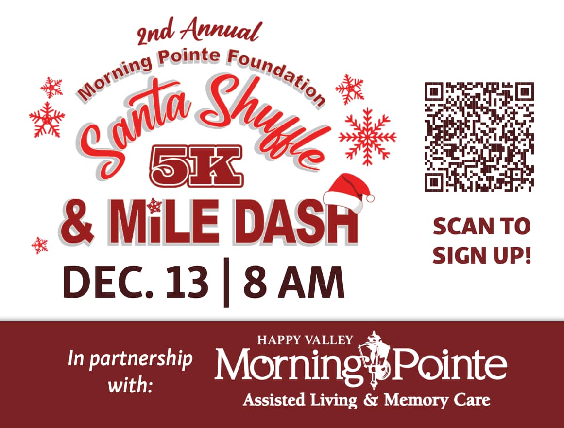 ROSSVILLE, Ga. —November 10, 2025 — Morning Pointe at Happy Valley will welcome runners, walkers, and families for a festive morning of fitness and philanthropy at the annual Santa Shuffle 5K & 1-Mile Fun Run on Saturday, December 13 at 8 a.m. All proceeds benefit the Morning Pointe Foundation’s nursing scholarship program, which helps train the next generation of senior-care caregivers across the Southeast.