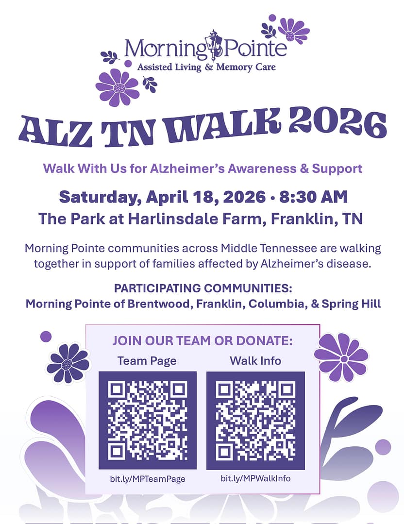 FRANKLIN, Tenn. — April 14, 2026— Morning Pointe Senior Living communities across Middle Tennessee will come together on Saturday, April 18, 2026, to support families affected by Alzheimer’s disease during the ALZ TN Walk at The Park at Harlinsdale Farm. The Morning Pointe–Middle TN team, representing communities in Brentwood, Franklin, Columbia, and Spring Hill, will